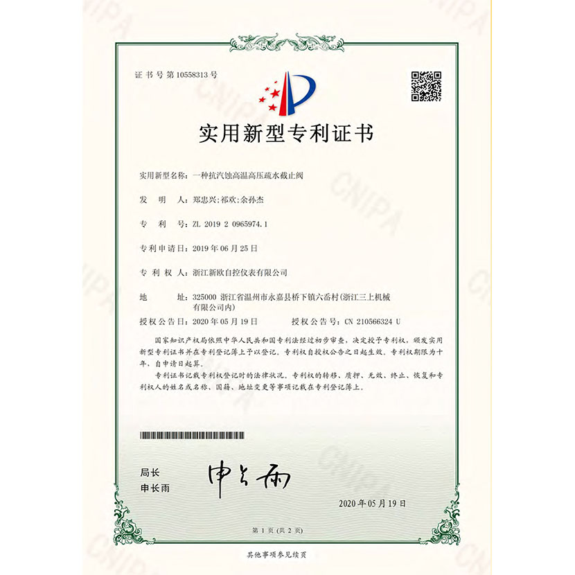 一種抗汽蝕高溫高壓疏水截止閥 專利證書(shū)